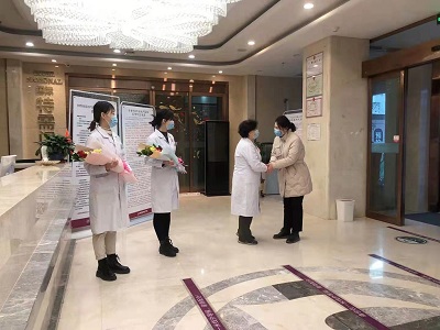 医院行政院长杨春秀、人力资源部负责人郭兴环、医务科负责人滕春霞、护理部负责人张红燕、客服部负责人王春霞早早等候在门诊大厅的入口,为每一位刚刚结束隔离,前来上班的医护志愿者送上了鲜花并致以亲切的问候,欢迎她们回家。
