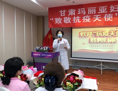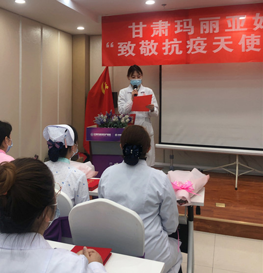 11月26日早上8点,甘肃玛丽亚妇产医院的一楼大厅里人员穿梭忙碌,一束束鲜花摆放在大厅里,大厅正中的紫色背景墙上悬挂着一条横幅,上面写着“欢迎抗疫一线的天使们胜利归来”。原来这是在准备着一个小型的欢迎仪式,欢迎医院驰援兰州市抗击新冠疫情一线的医护志愿者凯旋归来。