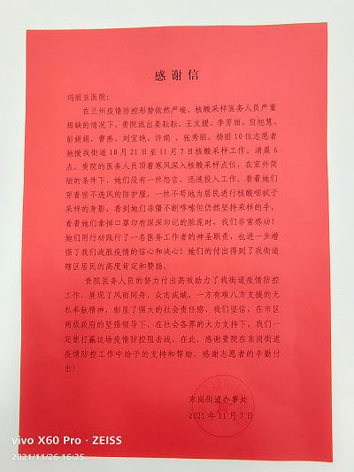 护理部负责人张红燕宣读了东岗街道办事处给医院发来的感谢信。感谢信对我院派出的志愿者不嫌条件简陋,不惧寒风刺骨,一丝不苟的为居民进行核酸咽拭子采样,哪怕冻的直哆嗦也一直坚守岗位,用行动践行了一名医务工作者的神圣职责,高效助力了东岗街道疫情防控工作表示了充分的肯定和高度的赞扬。对我院在东岗街道疫情防控工作中给予的支持和帮助表示衷心的感谢。